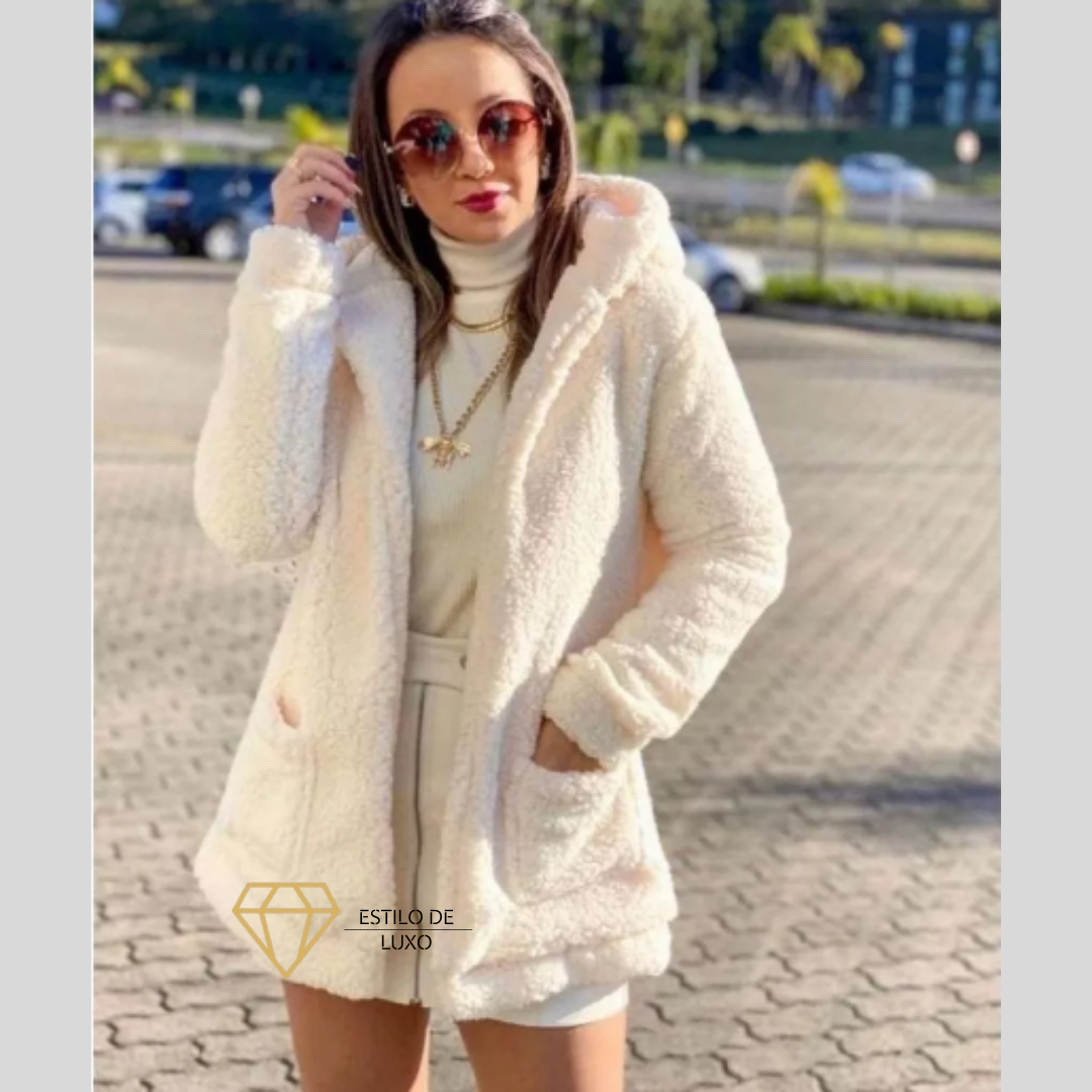 Sinta o aconchego e o estilo que você merece com o Casaco Feminino Max Teddy Peludo com Capuz e Bolso – a peça queridinha da estação!